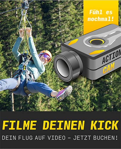 Du willst deinen Flug mit dem AlpspitzKICK nicht nur spüren, sondern auch für immer festhalten? Kein Problem! Buche ganz einfach unsere Action Cam zu deinem Flug an der Kasse dazu und erlebe dein Abenteuer immer wieder – so oft du willst.