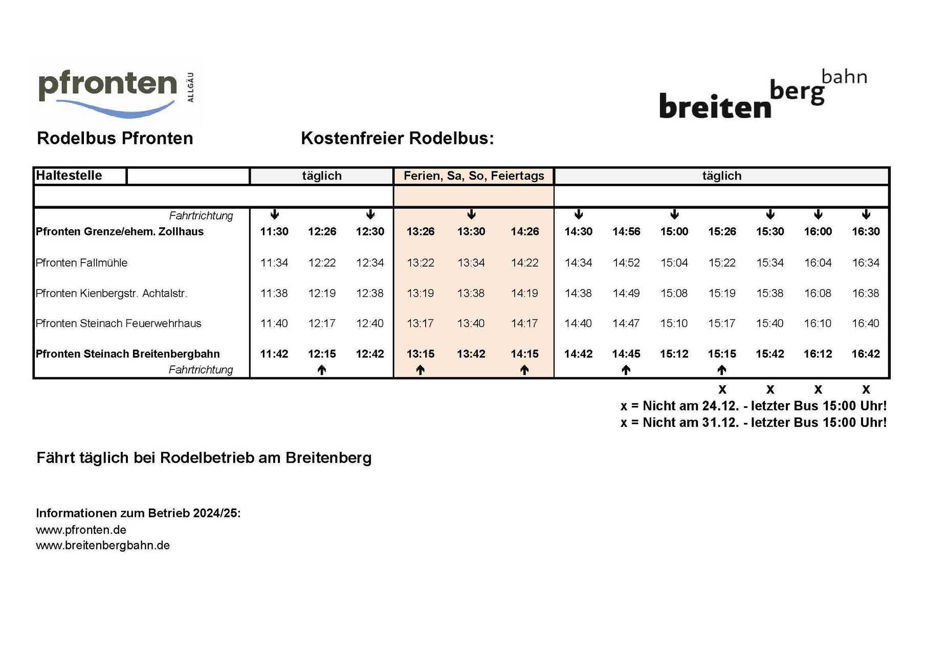 Bitte beachten: Der Rodelbus verkehrt nur bei Rodelbetrieb auf dem Breitenberg. Ob der Rodelbus fährt und die Rodelstrecken geöffnet sind, kann dem tagesaktuellen Wintersportbericht Pfronten entnommen werden.