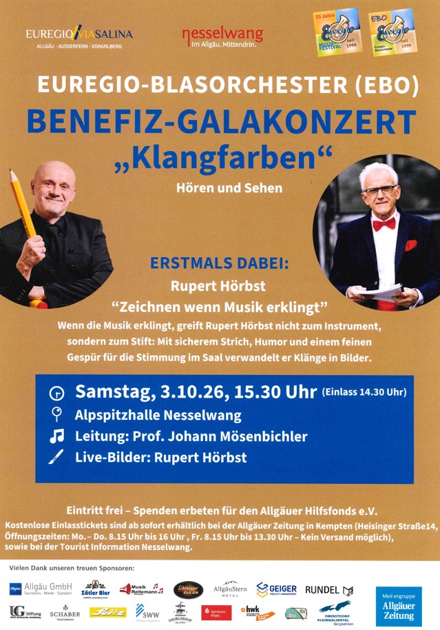 Auch in diesem Jahr präsentiert das EUREGIO-Blasorchester (EBO) ein Benefiz-Galakonzert in Nesselwang - am Samstag, den 3. Oktober 2026 ab 15.30 Uhr in der Alpspitzhalle.