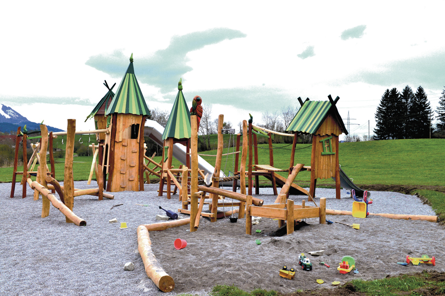 Ein 500 m² großer Abenteuerspielplatz zum Toben und Entdecken mit 2 Hüpfburgen bei guter Witterung im Sommer