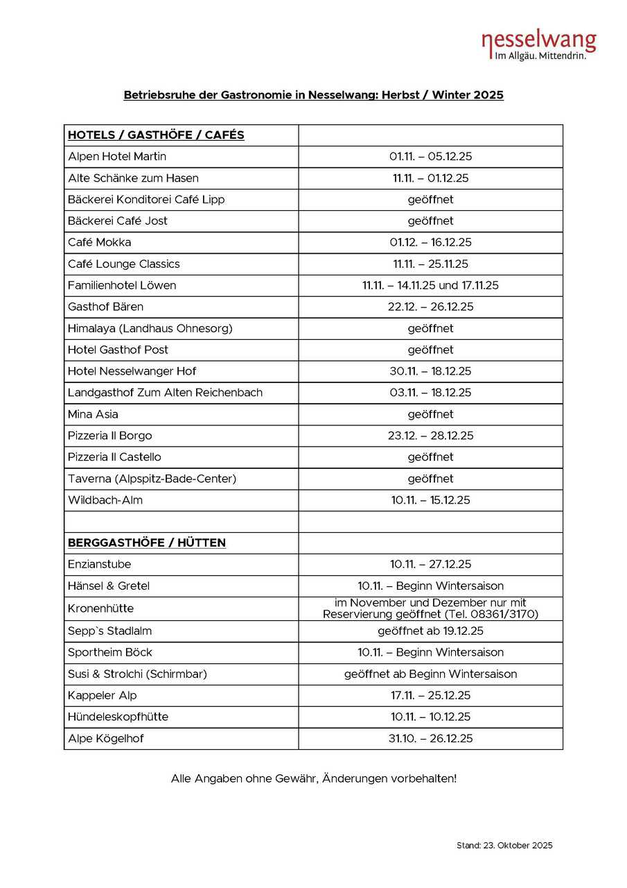 Betriebsferien der Nesselwanger Gastronomie im Herbst/Winter 2025 und Gastronomieangebot zum Jahreswechsel 2025/2026:
