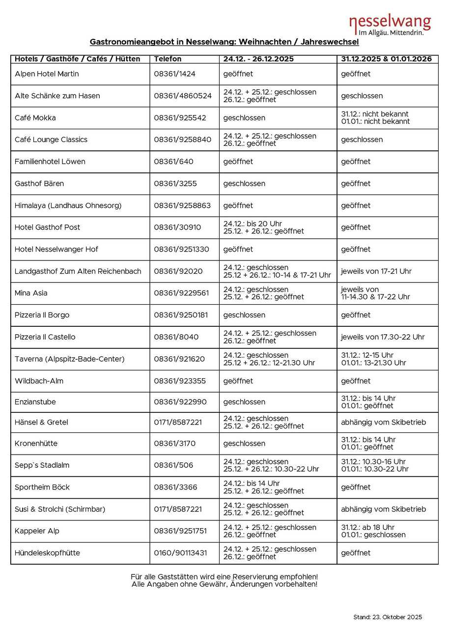In den beiden folgenden Dateien finden Sie die Betriebsferien der Nesselwanger Gastronomie im Herbst/Winter 2025 und das Gastronomieangebot zum Jahreswechsel 2025/2026. Kurzfristige Änderungen sind möglich.