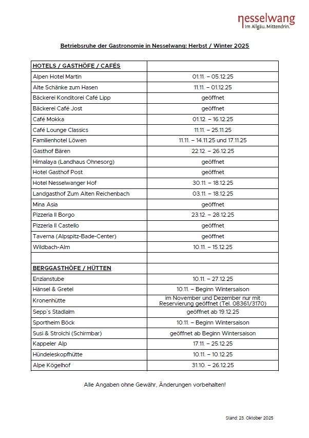Betriebsferien der Nesselwanger Gastronomie im Herbst/Winter 2025 und Gastronomieangebot zum Jahreswechsel 2025/2026: