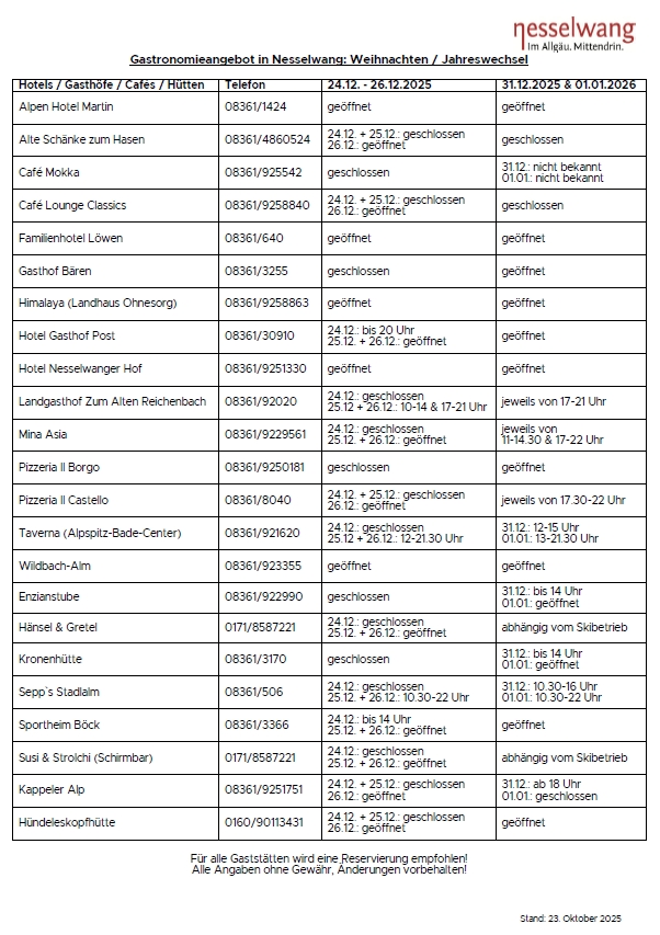 In den beiden folgenden Dateien finden Sie die Betriebsferien der Nesselwanger Gastronomie im Herbst/Winter 2025 und das Gastronomieangebot zum Jahreswechsel 2025/2026. Kurzfristige Änderungen sind möglich.