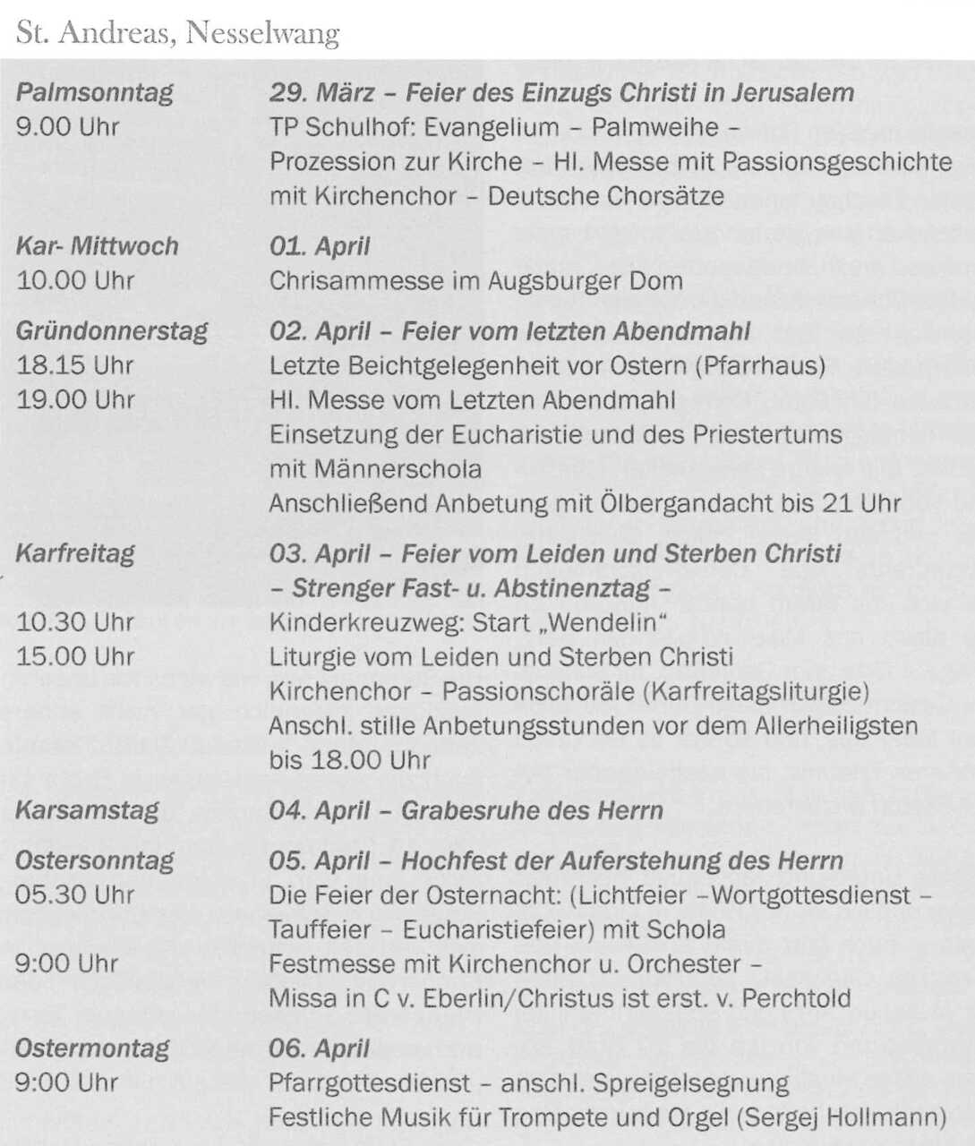 Die Anfänge der Pfarrei St. Andreas Nesselwang liegen im Dunkeln. Nach der Legende errichtete der heilige Magnus in der Mitte des 8. Jahrhunderts in dieser Gegend eine Bet-Zelle. Die Gründung der Pfarrei reicht wohl in diese Zeit zurück.