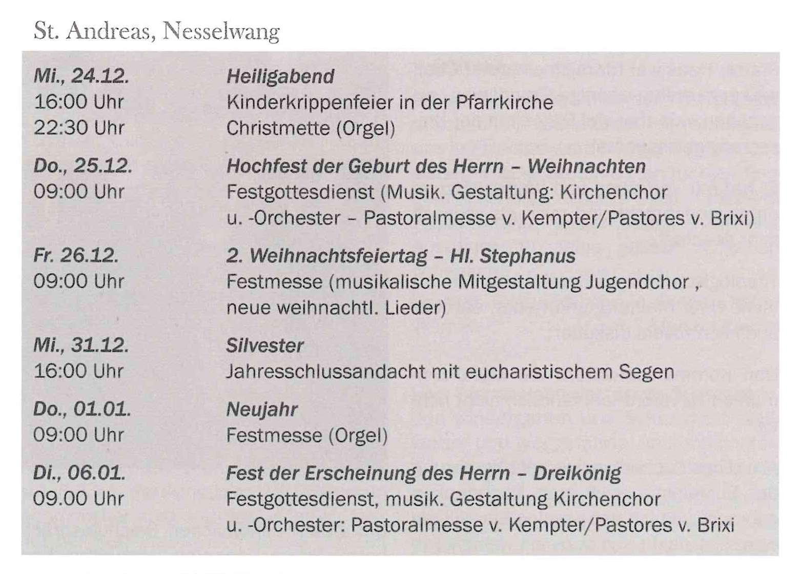 | Mittwoch | 31. Dezember | 22.00 Uhr | Jahresschlussandacht an Silvester |
