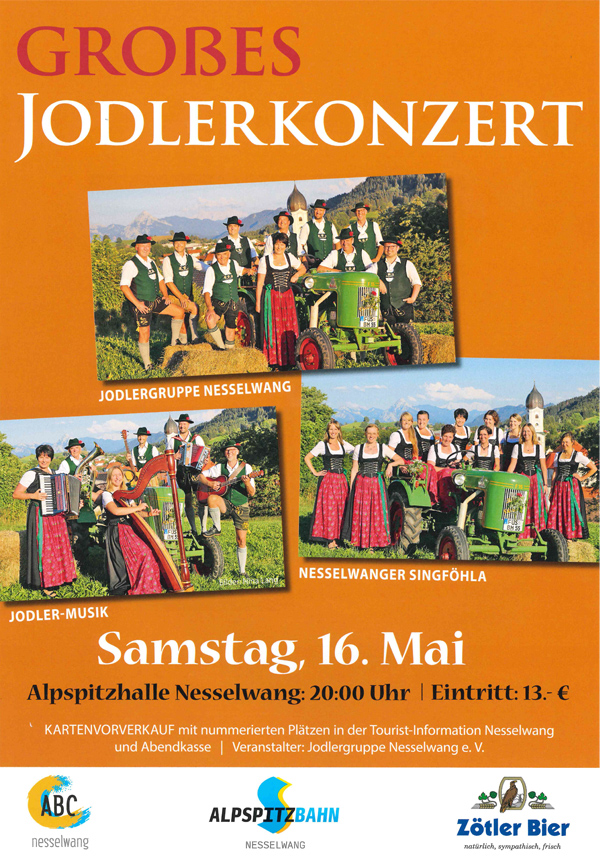 Die Jodlergruppe Nesselwang lädt alle Einheimischen und Gäste ganz herzlich zum "Großen Jodlerkonzert" am Samstag, den 16. Mai 2026 um 20 Uhr in die Alpspitzhalle Nesselwang ein.