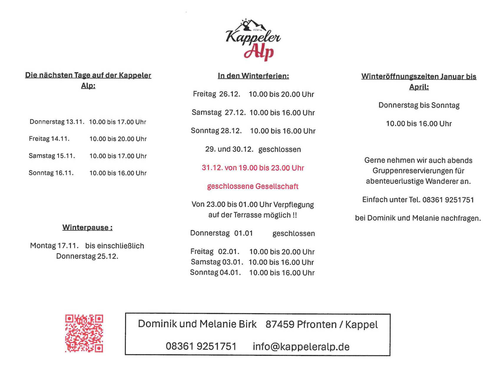 Winter-Öffnungszeiten (26. Dezember bis Ende April):