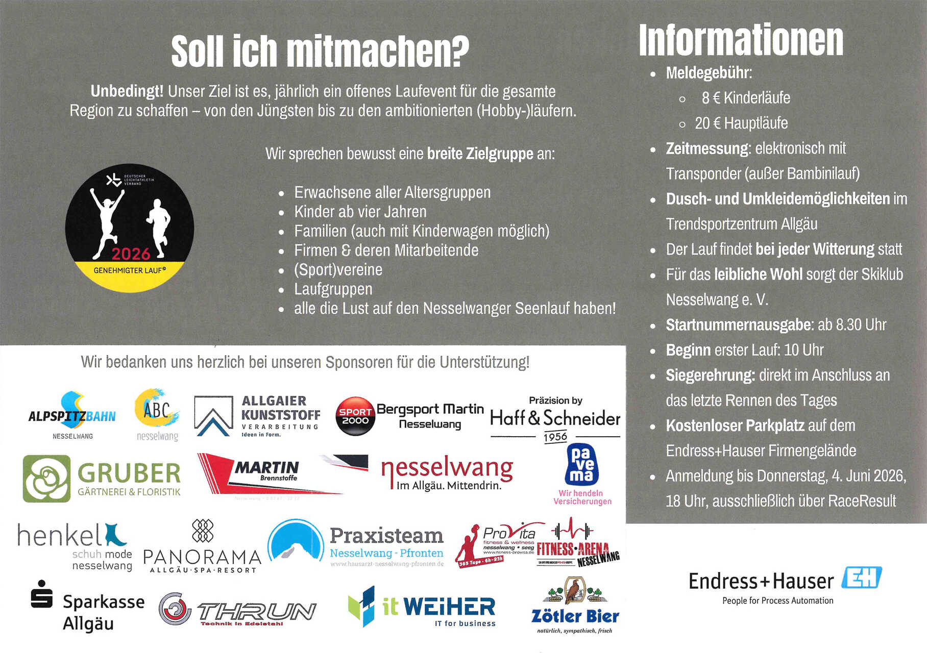 Der Nesselwanger Seenlauf, veranstaltet durch den Skiklub Nesselwang e. V., ist der Nachfolger des bisherigen Endress+Hauser Firmenlauf und baut auf dessen bewährtem Fundament auf. Der Lauf soll Menschen aller Altersgruppen zur Bewegung und Gemeinschaft begeistern.