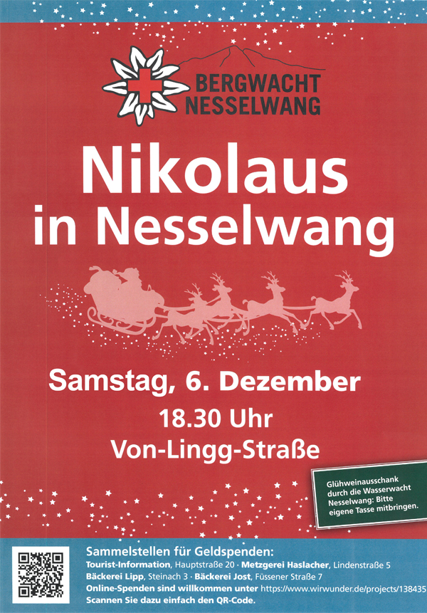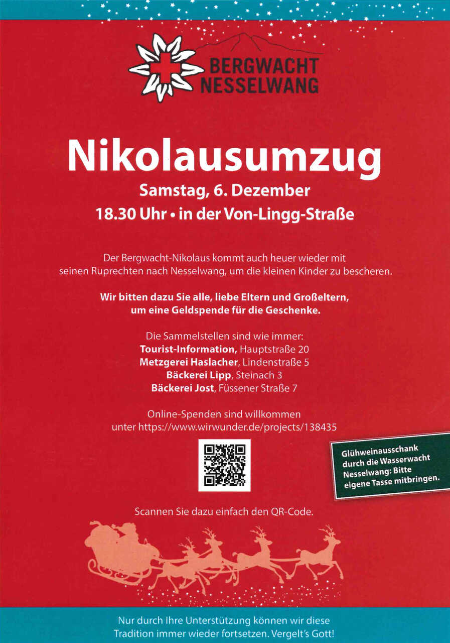 Am Samstag, den 6. Dezember 2025 veranstaltet die Bergwacht Nesselwang ab 18.30 Uhr den beliebten Nikolausumzug in der Von-Lingg-Straße.