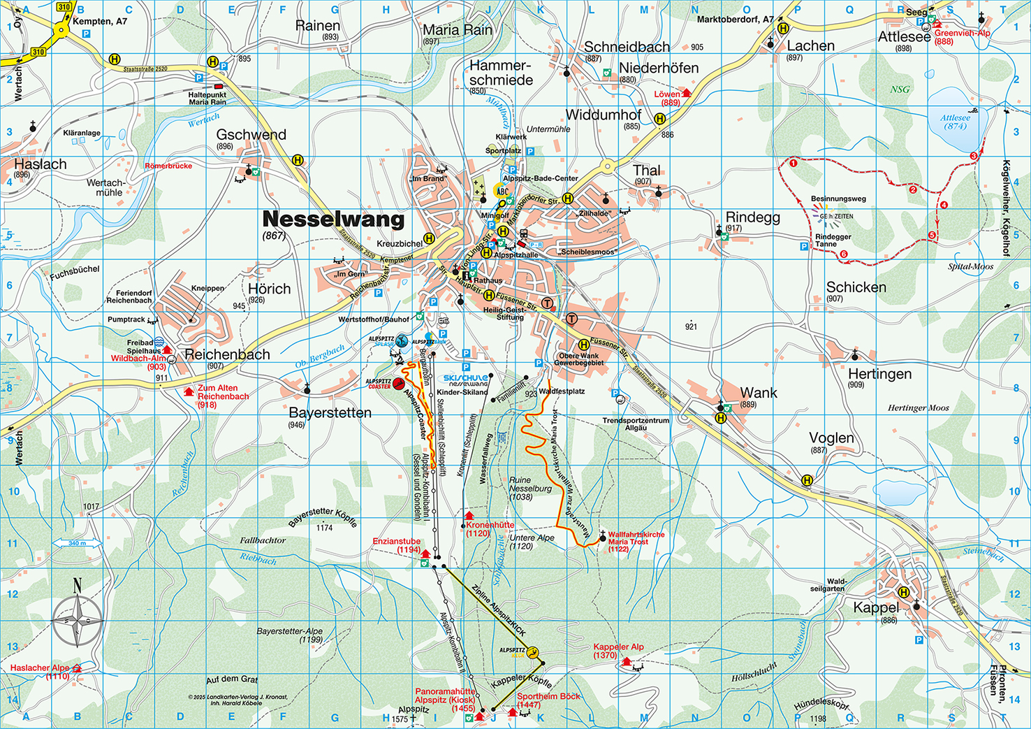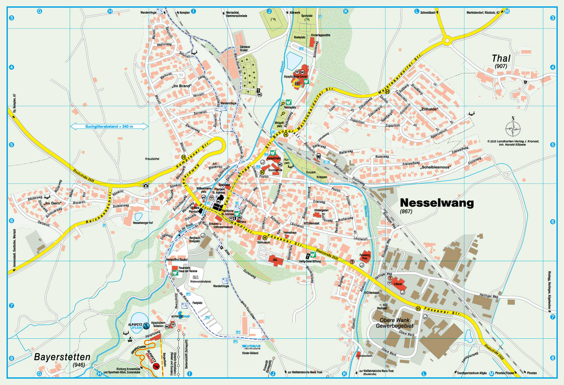 Nesselwanger Ortsplan mit Straßennamen, wichtigen öffentlichen Standorten, eingezeichnetem Trilogierundgang der Wandertrilogie Allgäu sowie Umgebungsplan mit allen Nesselwanger Ortsteilen (1 Quadrat entspricht ca. 340 m).